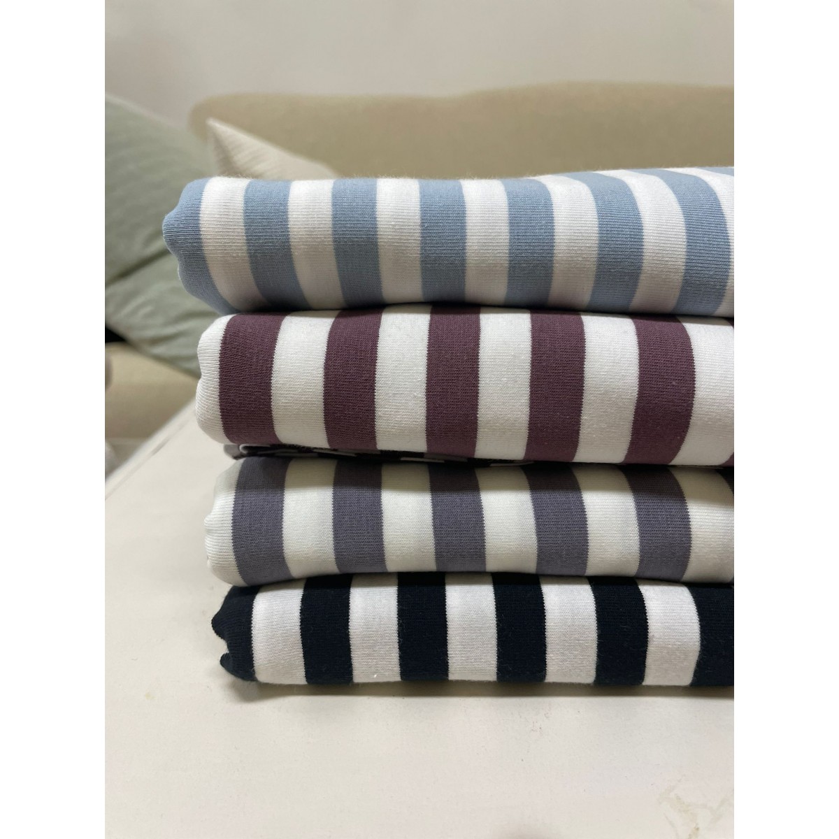 Questo bellissimo jersey di cotone con certificazione Oeko-Tex 100 ha una fantasia a righe e una mano piacevole al tatto.